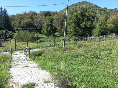L’invisibile ruscello (a sinistra) e l’invisibile piazzale (a destra) visti dal Ponte. La macchiolina bianca laggiù (sullo sfondo, al centro) è quanto resta della pavimentazione, completamente sommersa dall’erba e dai cespugli. In lontananza, a sinistra, si scorge sul ruscello il piccolo ponte in legno le cui condizioni sono documentate dalla prossima immagine... |